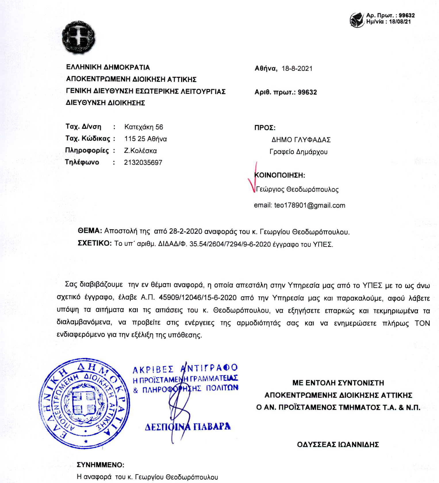 Δείτε και το έγγραφο από την αποκεντρωμένη διοίκηση αττικής που τους αναφέρει την από 28 Φεβρουαρίου καταγγελία του κ. Θεοδωρόπουλου Γιώργου και απευθύνεται στον Δήμαρχο και τους ζητά εξηγήσεις για τις παράνομες πινακίδες. Ποτέ δεν εδώθησαν αλλά και αυτό το έγγραφο κάπου χάθηκε.