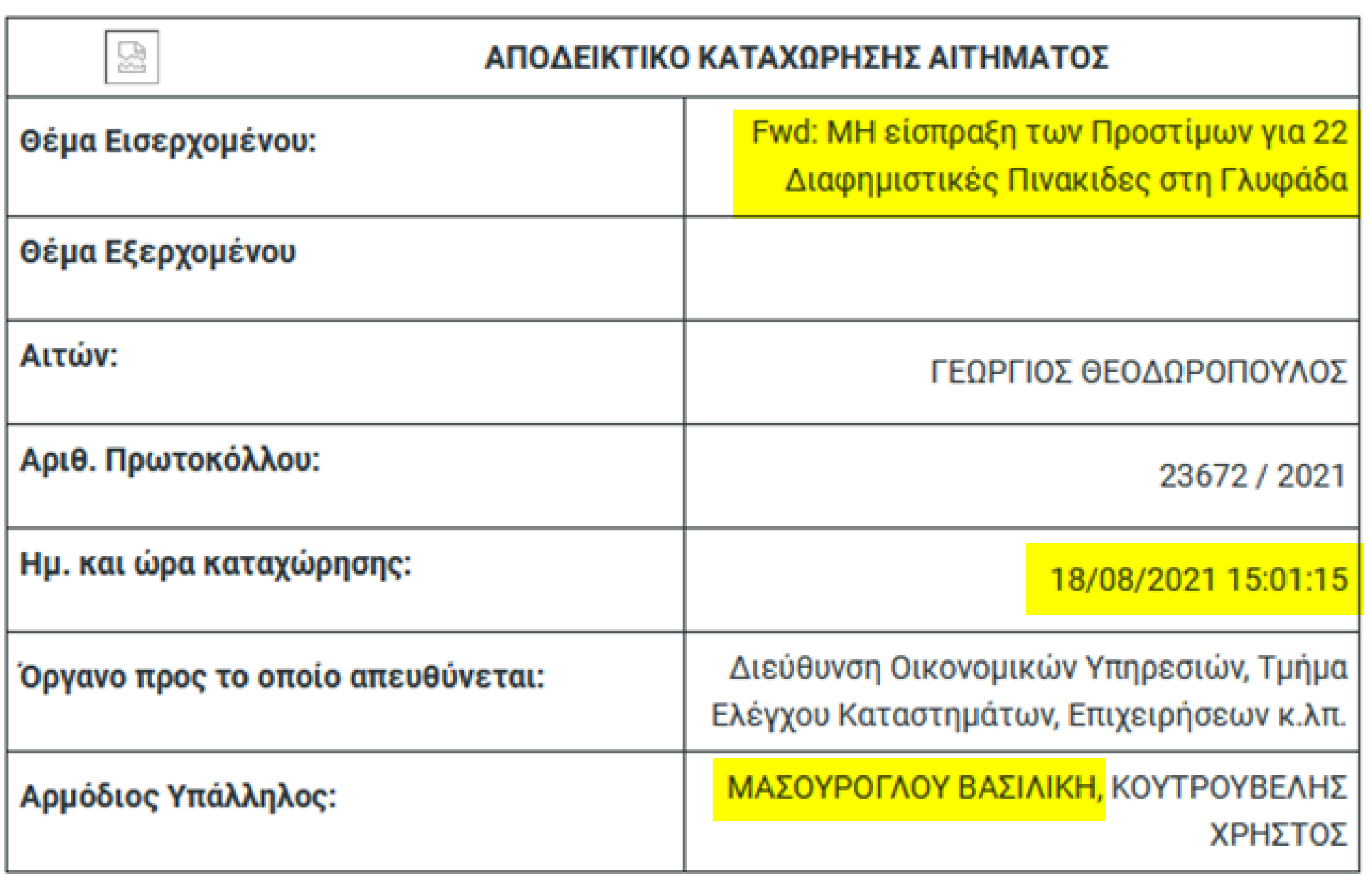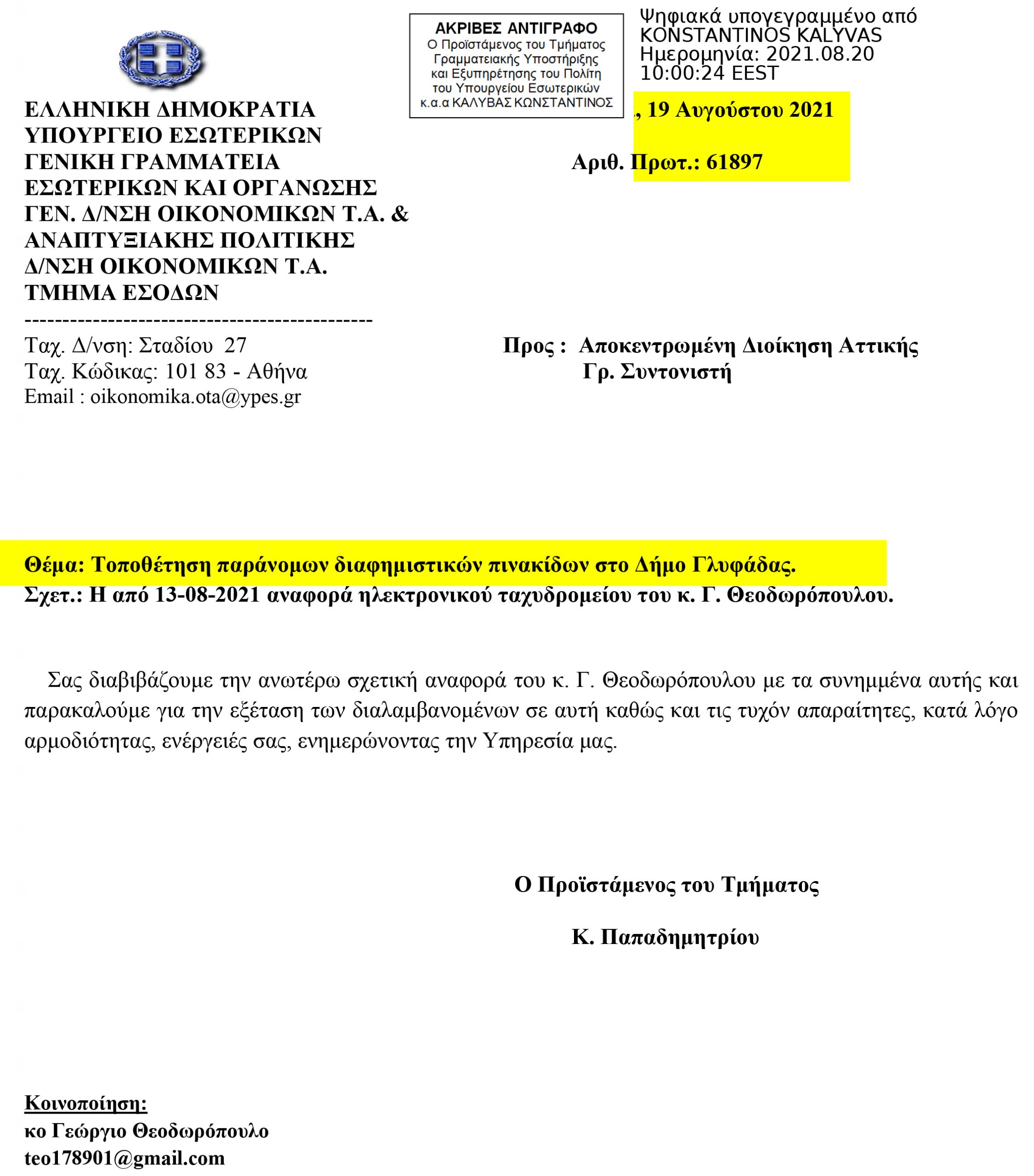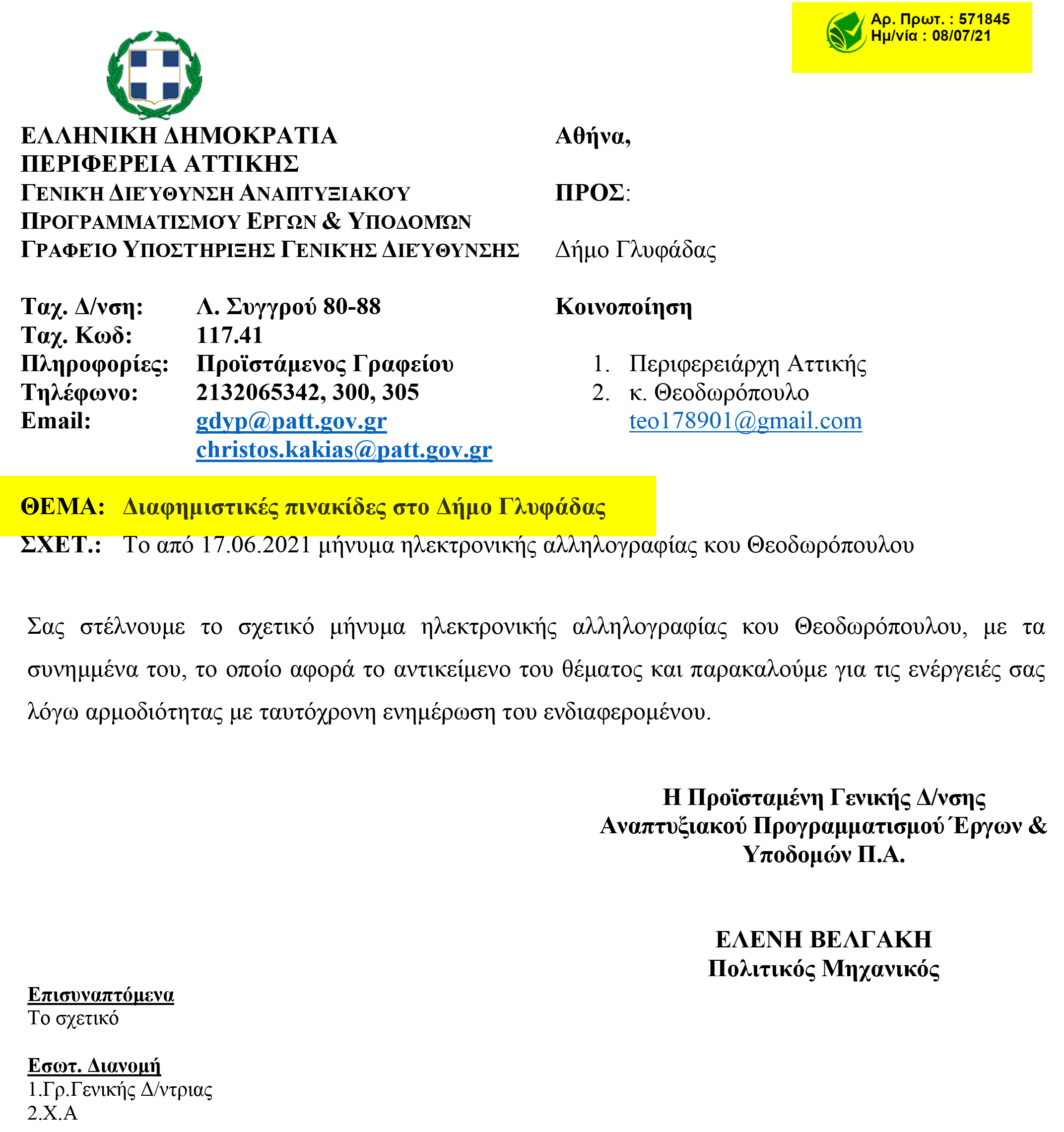 Δείτε ακόμα ένα χαμένο έγγραφο, αυτή τη φορά από το υπουργείο εσωτερικών, τον Αύγουστο. Το θέμα είναι ξεκάθαρο. Τοποθέτηση παράνομων διαφημιστικών πινακίδων στο Δήμο Γλυφάδας.