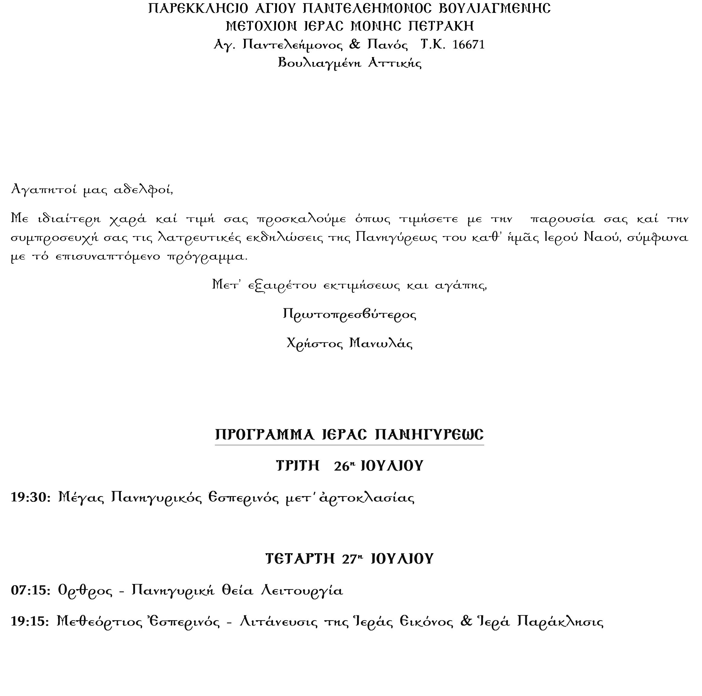 Με ιδιαίτερη χαρά και τιμή σας προσκαλούμε όπως τιμήσετε με τη παρουσία σας και την συμπροσευχή σας στις λατρευτικές εκδηλώσεις της Πανηγύρεως του καθ’ ημάς Ιερού Ναού, σύμφωνα με το επισυναπτόμενο πρόγραμμα.