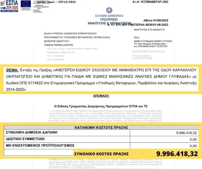 «Κι όμως, υπάρχουν σπουδαίες ειδήσεις τον Αύγουστο! Και μάλιστα από αυτές που μπορούν να αλλάξουν τη ζωή πολλών. Αυτή η είδηση ήρθε στη Γλυφάδα μας και αφορά την πλήρη χρηματοδότηση με ευρωπαϊκούς πόρους για το πρώτο Ειδικό Σχολείο στην πόλη μας!