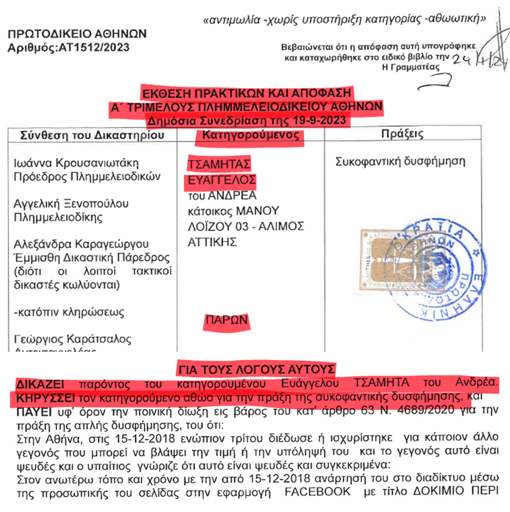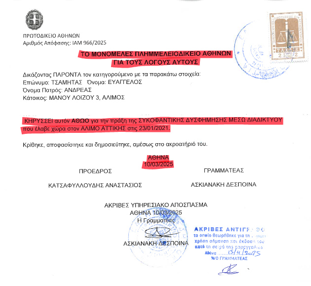 Το ΙΑ΄ Μονομελές Πλημμελειοδικείο Αθηνών, με την απόφαση 966/2025 και Πρόεδρο τον κ. Αναστάσιο Κατσαφυλλούδη, απεφάνθη αθώωση.
